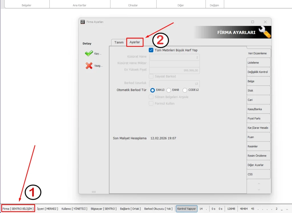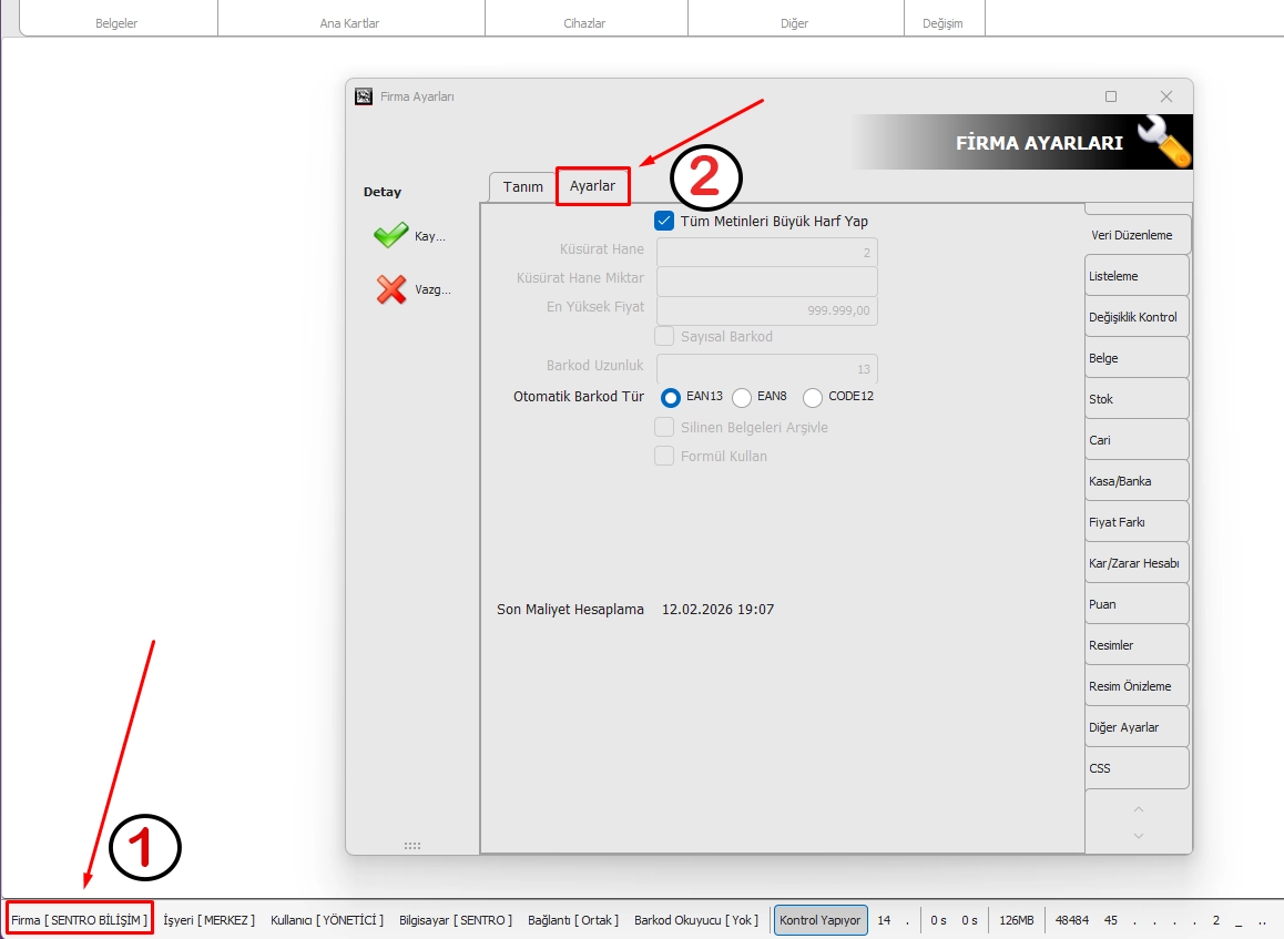 En yüksek fiyat, sayısal barkod, barkod uzunluk ayarlarının değiştirilmesi için resimdeki ayarların olduğu kısma gidilir.
